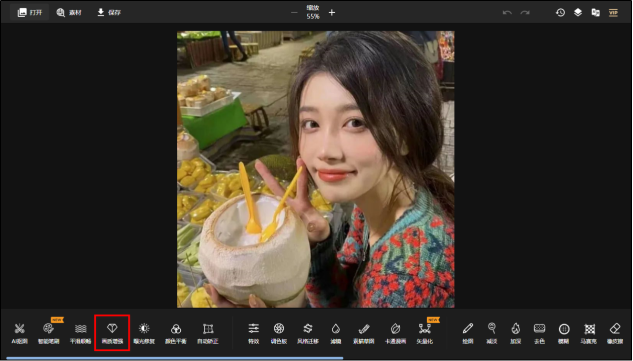 有点冷门的一个在线图片编辑器,具备智能抠图、修复照片、增强画质、抠图等功能,支持AI修复图片画质,从而提高像素。