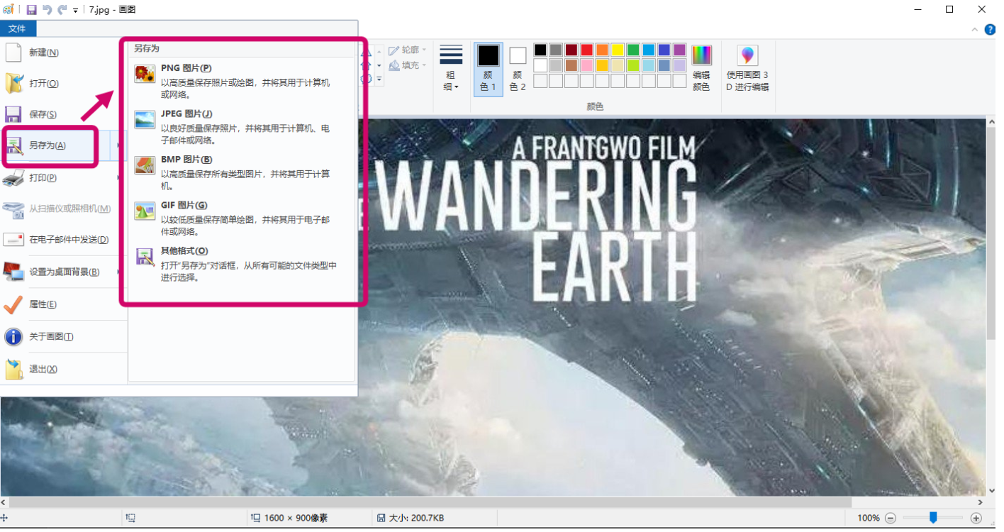 然后在画图这种点击文件,选中另存为,保存为需要转换成的文件格式即可