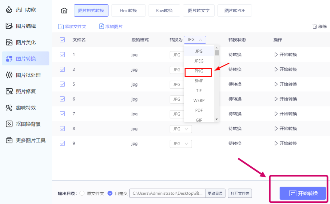 3.选择转换的格式为PNG,点击开始转换即可完成操作