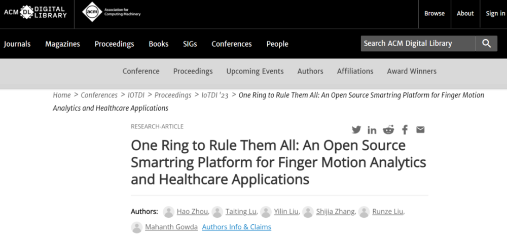 近日,相关论文以《一个戒指来监测所有:用于手指运动分析和医疗保健应用的开源智能平台》(One Ring to Rule Them All: An Open Source Smartring Platform for Finger Motion Analytics and Healthcare Applications)为题发表于 ACM/IEEE Conference on Internet of Things Design and Implementation,并获得最佳论文之Best Paper Award For IoT Edge AI[1]。