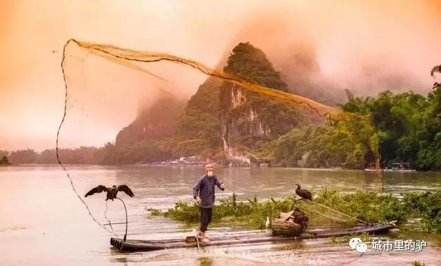 雾气蒙蒙的清晨、斜阳西下的傍晚、明月当空的夜晚,江中的点点渔火、身披蓑衣的渔翁和身旁矫健的鱼鹰、江心的一叶扁舟...