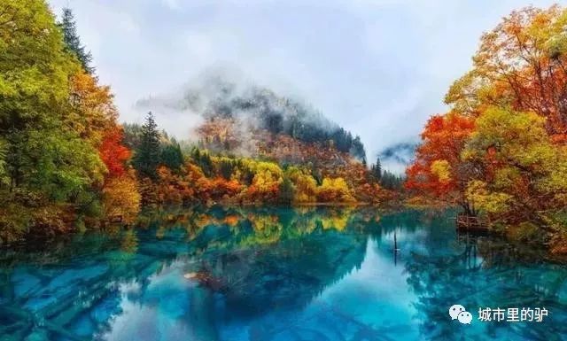 静谧淡蓝的湖水、五彩斑斓的红叶、倒映水中的彩林、缤纷的落英、悠远碧蓝的晴空下、湖光流韵……九寨沟的秋天美若仙境!