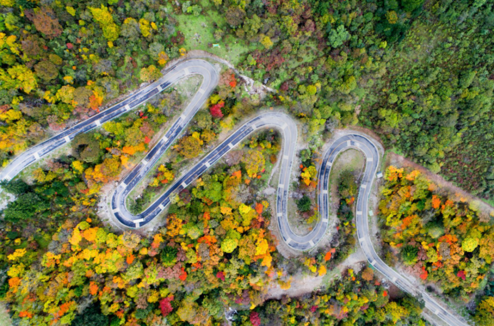 “树树皆秋色,山山似落晖”……那是再天才的画家都难以调出的颜色壮阔的秋天,从群山之间喷薄而出!