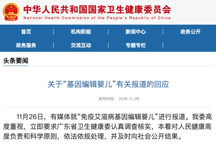 11 月 26 日,有媒体就“免疫艾滋病基因编辑婴儿”进行报道。我委高度重视,立即要求广东省卫生健康委认真调查核实,本着对人民健康高度负责和科学原则,依法依规处理,并及时向社会公开结果。