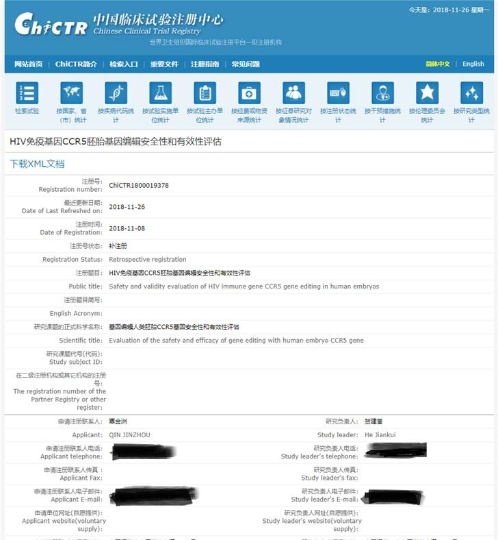 随后,中国临床试验注册中心官网上的《HIV 免疫基因 CCR5 胚胎基因编辑安全性和有效性评估》一份注册信息显示,该项目补注册于 2018 年 11 月 08 日,最近更新于 11 月 26 日。研究课题的正式科学名称为“基因编辑人类胚胎 CCR5 基因安全性和有效性评估”。此前网上流传的《深圳和美妇儿科医院医学伦理委员会审查申请书》正是该项目的伦理委员会批件。