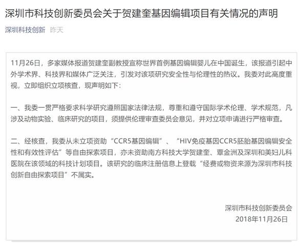 然而,关于基因编辑婴儿经费来源一事,深圳市科技创新委员会也在其官方微信公众平台进行了连夜回应。深圳市科技创新委员会表示,从未立项资助 “CCR5 基因编辑”、“HIV 免疫基因 CCR5 胚胎基因编辑安全性和有效性评估”等自由探索项目,亦未资助南方科技大学贺建奎、覃金洲及深圳和美妇儿科医院在该领域的科技计划项目。
