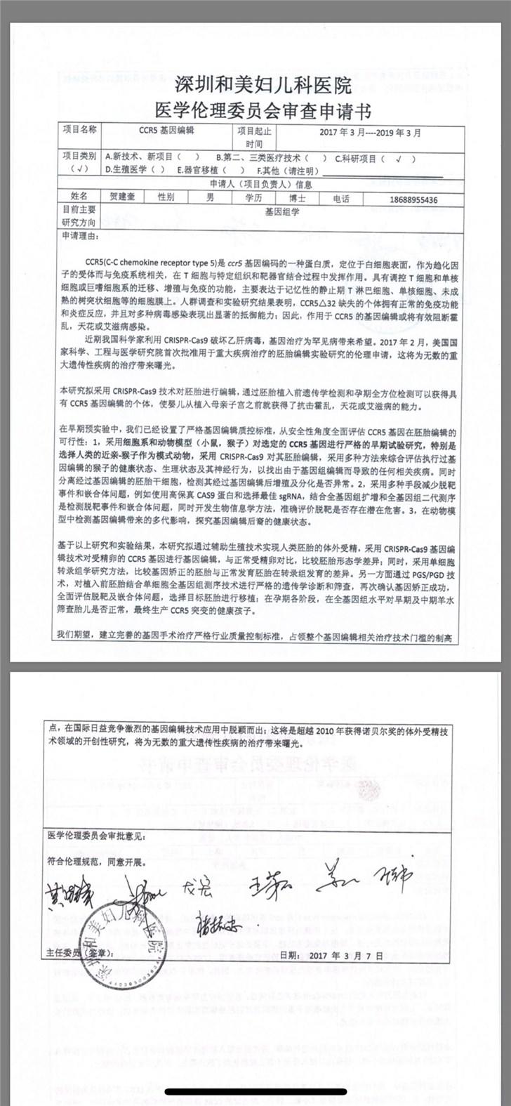 上述资料显示,该项目正式名称为 CCR5 基因编辑,立项时间为 2017 年 3 月,其中该院医学伦理委员会的审批意见为符合伦理规范,并同意展开。落款为七位审批人的签名,日期为 2017 年 3 月 7 日。