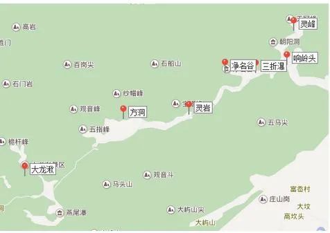 参考路线:鸣玉溪——接客僧————果盒三(凝碧潭、果盒桥、果盒岩)——风洞——东西瑶台——合掌峰——观音洞——泉水三束(洗心、漱玉、石釜)——北斗洞——凌霄殿———白云庵。