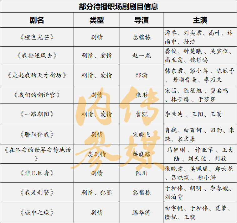据不完全统计,待播的职场剧达十部以上,重点剧集包括《橙色光芒》《在不安的世界安静地活》等。