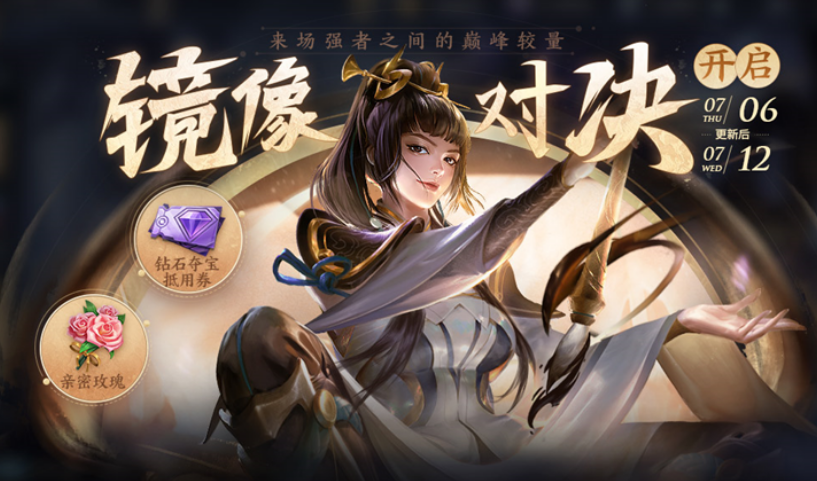 活动时间:7月6日更新后-7月12日23:59,使用米莱狄、诸葛亮、杨玉环、上官婉儿、海月、西施、小乔、周瑜、貂蝉、王昭君参与镜像对决可以获得钻石夺宝抵用券,而且获胜还可以获得亲密玫瑰。