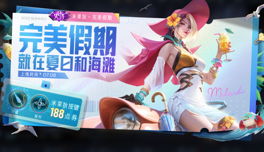 上架时间:7月8日,这款皮肤是一款史诗级的直售皮肤,也是第六款夏日海滩系列的皮肤了,这款皮肤售价888点券,首周(7月8日0:00-7月14日23:59)折扣710点券,这款皮肤也是非常的漂亮,粉色披风、粉色沙滩帽、黑白金泳装,还有大长腿,而且米莱狄的机械普攻也变成了螃蟹管家,非常可爱。