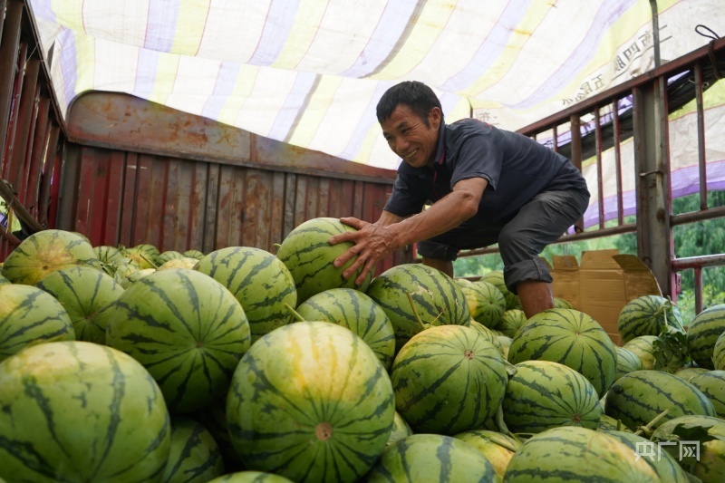 “去年我们和这里的农户合作,西瓜脆甜、皮薄,销量非常好,今天运了2万斤,后期大量成熟,我们还会继续来。”批发商杜景辉说。