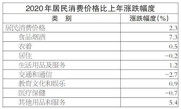 全年居民消费价格比上年上涨2.3%。其中,食品烟酒价格上涨7.3%,衣着价格上涨0.5%,居住价格回落0.2%,生活用品及服务价格上涨1.2%,教育文化和娱乐价格上涨0.9%,其他用品和服务价格上涨5.4%。