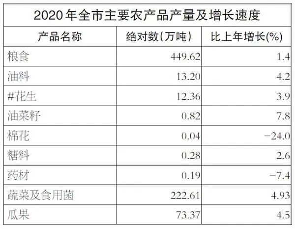 全年粮食作物种植面积93.82万公顷,比上年下降0.1%;粮食产量449.62万吨,比上年增产6.11万吨,增长1.4%。其中,夏粮267.17万吨,减产1.66万吨,下降0.6%;秋粮182.45万吨,增产7.77万吨,增长4.5%。油料产量13.20万吨,增长4.2%。棉花产量0.04万吨,下降24.0%。蔬菜及食用菌产量222.61万吨,增长4.9%。