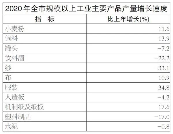 规模以上工业统计的主要产品产量中,小麦粉比上年增长11.6%,饲料增长13.9%,罐头下降7.2%,机制纸及纸板增长17.6%,商品混凝土下降0.8%。