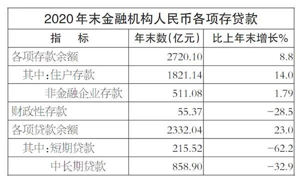 年末全市金融机构人民币各项存款余额2720.10亿元,增长8.8%。其中,住户存款余额1821.14亿元,增长14.0%。金融机构各项贷款余额2332.04亿元,增长23.0%。全市金融机构存贷比85.7%,比上年提高9.8个百分点。