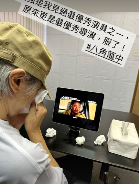 周星驰在ins上发布了这一幕,白发苍苍的他正用纸巾掩面而泣,平板播放着《八角笼中》预告片,而桌面上早已放了好几砣揉在一起的纸巾,看来这场面不小,星爷是动了真情。