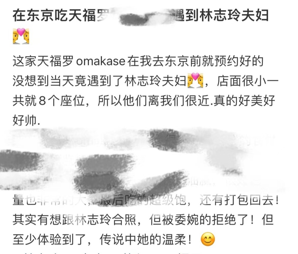 7月4日,有媒体曝光了林志玲的近照。她在日本外出就餐时被网友偶遇,身处的餐厅是预约制的,现场只能容纳八个人,所以网友获得了一次与她近距离相处的机会,不过林志玲最后以喝酒为由拒绝了合照。