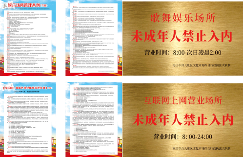 为使得全区网吧和歌舞娱乐场所规范管理,区文旅局规范设立禁止未成年人进入警示标识和警示牌,所有营业场所在醒目位置悬挂“未成年人禁入”标识及相关管理条例。
