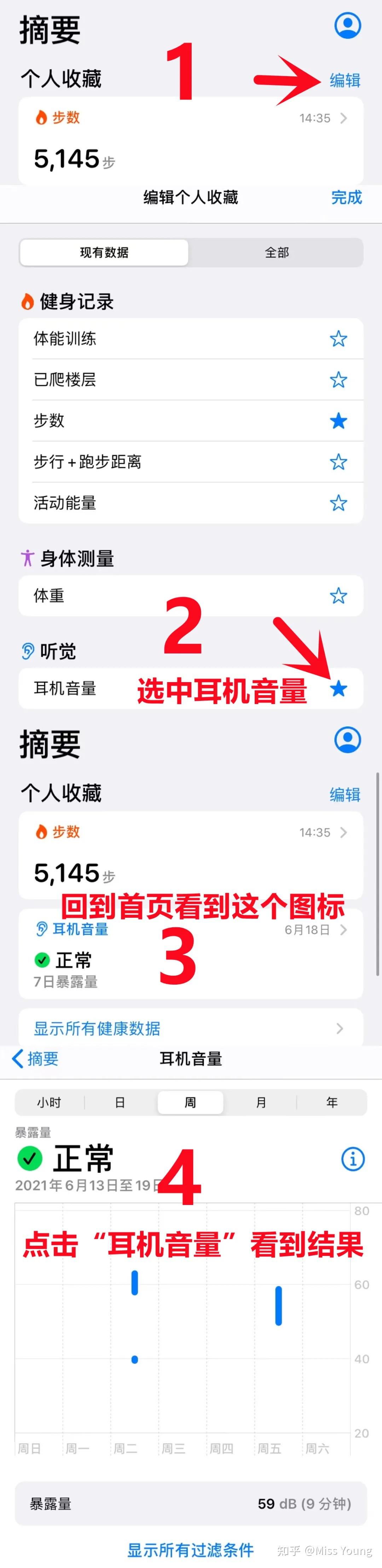 还可以定期监测自己的声音使用情况,拿苹果手机来说,它上面自带的健康app就能检测你最近一周播放的音量在不在安全范围。