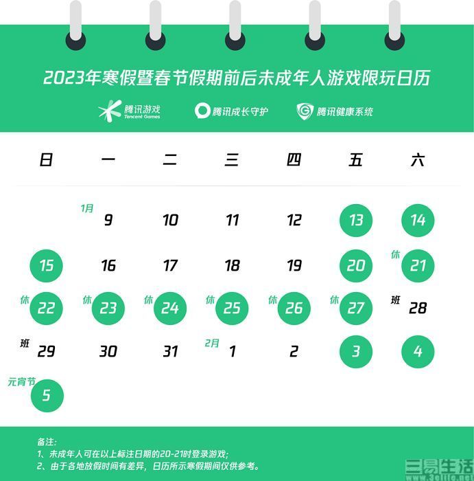 日前,腾讯游戏方面公布了未成年人2023年春节及寒假期间限玩通知。其中显示,未成年玩家可于寒假中的每周五、六、日,以及1月20日至1月27日(春节假期)每日20时至21时之间登录游戏,1月28日至1月29日调班以及其余寒假内工作日则均为禁玩时段。