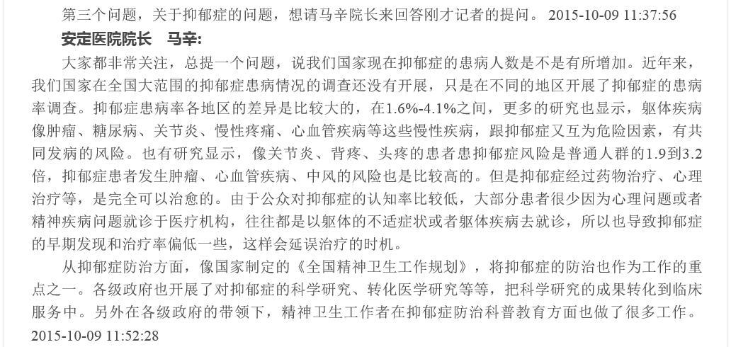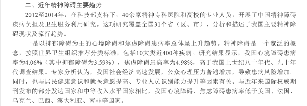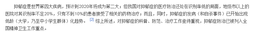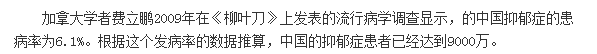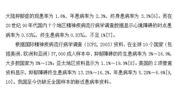 至于楼主的医生提到的“抑郁症越来越普遍”的提法,我猜想,应该是出自他的个人工作经验和体会,或者精神卫生系统的内部资料,个人认为,是有相当可信度的。
