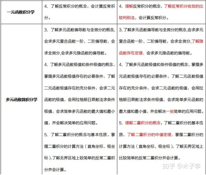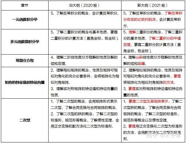 数学一主要是增加了反常积分敛散性的比较判别法、无穷级数增加积分判别法,然后一些内容由原来的了解、会用改为了理解和掌握,要求有了一定的提高。