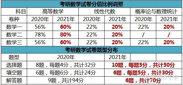 数学一:高数56%+现代22%+概率论22%调整为高数60%+现代20%+概率论20%;数学二:高数78%+现代22%调整为高数80%+现代20%;数学三:高数56%+现代22%+概率论22%调整为高数60%+现代20%+概率论20%。
