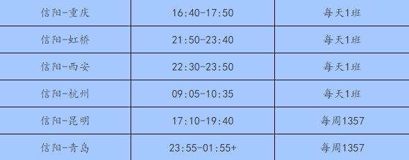 10月11日,信阳明港机场首航航班及票价出炉,信阳开通至重庆、虹桥、西安、杭州、昆明、青岛6条航线,首航三日单程最低票价为150元、往返为300元(不含税)。机票销售日期为2018年10月13日至28日,乘机日期为2018年10月28日至30日。