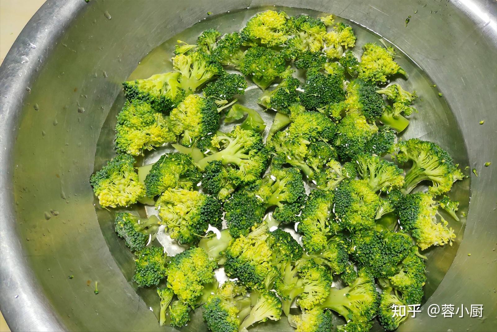 1、西兰花切成小朵,先用清水冲洗两遍,再用淡盐水浸泡10分钟,然后倒掉盐水,用流动水再冲洗两遍;