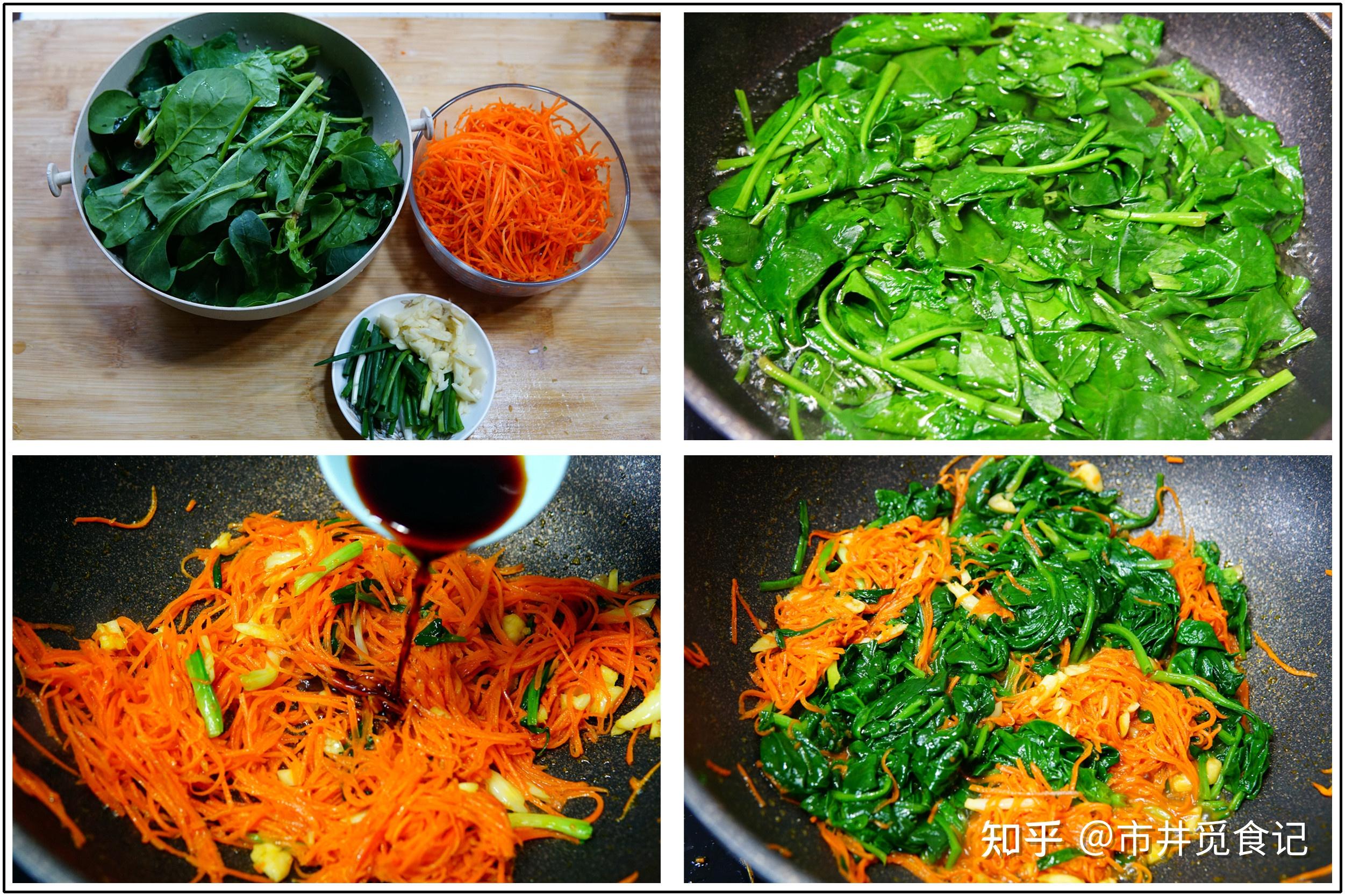 1、菠菜洗净撕开,胡萝卜擦成丝,小葱切段,大蒜拍扁切碎。