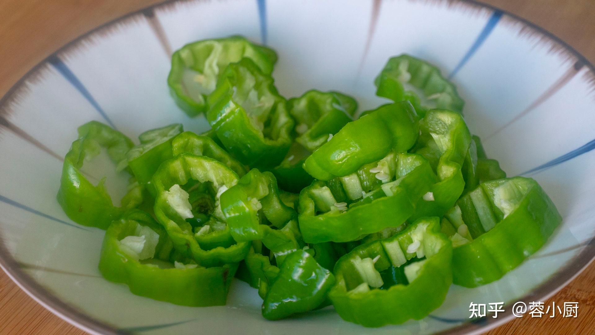 2、接着准备2个青椒,洗净后去籽切小块儿,装入碗里。