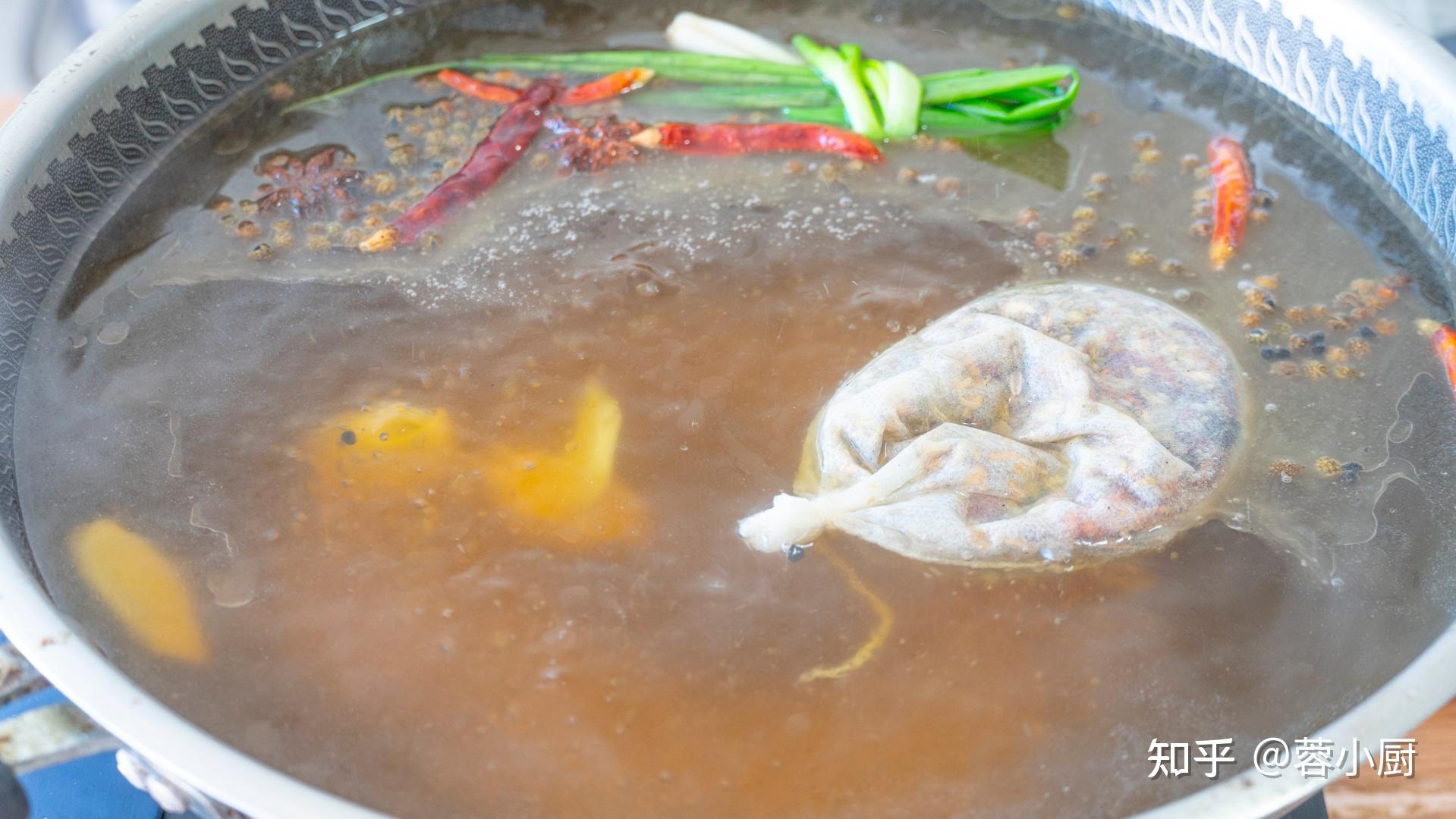 4、然后倒入开水,加葱结、姜片、干辣椒、花椒、八角,再来一个卤料包,没有的话其实也可以不加,卤料包主要的作用是增香提味儿,其实一般的大料也是可以的。