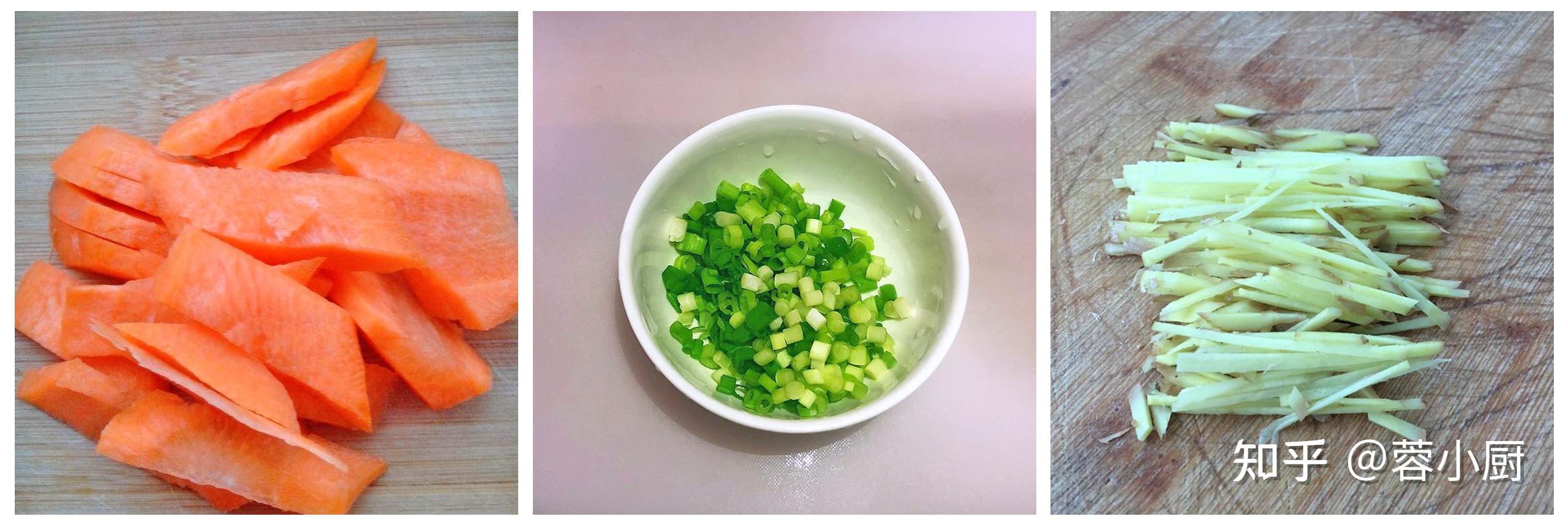 4、胡萝卜切片,葱切葱花、姜切丝备用;