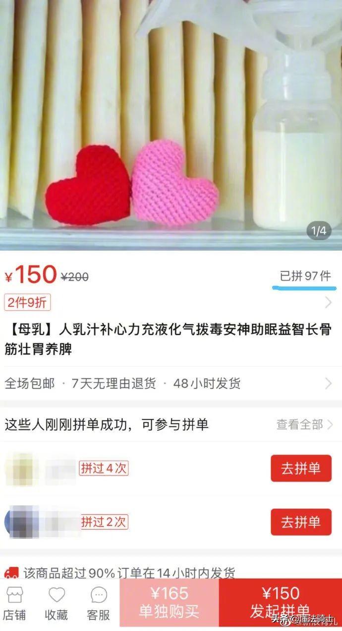 据成都商报、红星新闻 报道:3月28日,有网友爆料称,有商家在拼多多 售卖“母乳”,150元一袋。一家名为“遇见是美”的店铺内,“母乳”作为唯一上架商品已售卖97袋,单价为100毫升150元,目前库存还有6袋。该店铺称,库存真实,母乳冷藏可保存3天,冷冻可保存3个月,宝宝喝不完吸出来马上冷冻保存,并表示“宝妈生产全面体检健康,核酸检测正常,有献血和脐带血捐献。”