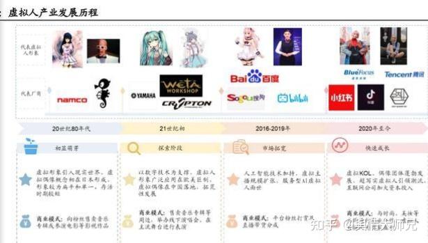 2.第二阶段(21世纪初期):踏足影视娱乐行业,步入探索阶段21世纪初期,CG技术、动作面部捕捉技术发展日益成熟,以数字技术为支撑的虚拟角色面部表情、动作等更加丰满。这一阶段的虚拟形象主要为虚拟及电影中的 虚拟角色,如初音未来、洛天依、《指环王》咕噜等,参与公司为顶尖CG公司、音 乐制作公司、媒体公司,除了通过售卖音乐专辑等周边进行基本的盈利外,举办线 下演唱会或在主流舞台进行表演等也成为了商业价值落地的主要形式。但该时期虚拟偶像市场规模较小,动捕、CG等技术水平不够成熟,并且没有获得足 够的资源和公司支持,演出效果和运营方式并不理想,虚拟人并没有被大众广泛受。3.第三阶段(2016-2019年):商业化起步,虚拟偶像与服务型虚拟率先发展2016年后,随着技术发展,IP型与非IP型虚拟人均开始商业化起步。IP型虚拟人方 面,海内外社交平台开始涌现出大量虚拟主播(Vtuber),这一时期的Vtuber形象以 二次元、卡通风格为主,多由“中之人”扮演,利用粉丝经济,通过平台粉丝打赏及直 播分成实现盈利,吸粉能力可观。非IP型虚拟人方面,在人工智能等技术的加持下, 虚拟人应用逐渐进入主流市场,传统媒体及商业机构开始使用服务型AI虚拟人进行 业务辅助。这一时期,Bilibili、BKizuna AI等公司纷纷推出虚拟主播Vtuber;搜狗、 百度等科技公司也陆续进入虚拟人赛道,布局服务型虚拟人。2017年,B站推出“虚 拟次元计划”,打造了国内初代虚拟UP主小希和小桃; 2019 年,浦发银行和百度同数字员工“小浦”。4.第四阶段(2020年至今):行业迅速成长,创作蓬勃发展,资本加大投入2020年以来,不同类型虚拟人的商业模式随着行业的迅速成长,逐渐清晰。海内外 虚拟KOL、虚拟偶像团体等引领潮流,形象风格多变,商业价值凸显;虚拟网红KOL 与时尚、美妆等品牌合作产生了较好的商业价值;服务型虚拟人在直播间实现24时不间断直播也给商家带来了更多盈利。随着元宇宙概念的升温,头部互联网公司 以虚拟切入点悉数入局,加大资本投入。目前腾讯、字节跳动、阿里、网易等互 联网公司均在虚拟人方向投资布局,大禹网络、次世文化等MCN公司拓宽了虚拟形的设计和运营业务,蓝色光标等营销公司不断加强虚拟人领域的营销服务能力, 小红书、抖音等社交平台也对虚拟偶像博主进行布局和引流。