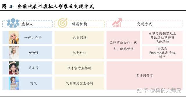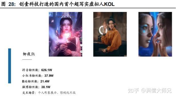2.虚拟KOL:场景化的消费者触点,美妆、时尚穿搭领域品牌合作虚拟KOL可以使品牌更贴近年轻消费群体,更准确的传递品牌调性。虚拟人KOL有 着场景化的消费者触点,在美妆和服饰穿搭等领域尤为突出,其不受物理条件约束、 可以随意调整的特点能更好适应快速更迭的商业节奏。虚拟KOL在美妆、时尚、穿 搭、短视频等赛道不断渗透,主要商业模式为广告推广、代言等。未来随着技术升 级,还通过直播带货的方式进行变现。AYAYI :与真人明星共同为品牌站台,打破虚实界限感。目前AYAYI小红书账号已有超过11万粉丝,并和娇兰等高奢 品牌达成了广告合作,分享的日常内容平均获赞数为4500左右,商业合作内容平均 获赞数为1145左右,数量可观。相比于同粉丝量级的真人KOL,虚拟KOL发布内容频率更高、质量较好,商业合作的内容占比较大、获赞数高,体现品牌对这一形态的 认可,也体现消费者好奇心驱动带来的粘性,进一步带来更大的商业价值。柳夜熙:元宇宙+美妆赛道的虚拟KOL,“会捉妖的美妆博主”人设另辟蹊径。通过和 粉丝量相当的真人KOL的数据对比,活跃于抖音的头部虚拟KOL代表柳夜熙在今年 10月底才在抖音发布了第一个短视频,就获赞高达351万。截止2021/12/6,粉丝量 已累计达到626.1万,当前粉丝量还在持续增长。虽然暂时还没有开始与其他品牌正 式合作,但凭借平均一条视频218.4万的获赞数,以及最高单条视频获赞351万的数 据,足以窥见人设为“会捉妖的美妆博主”的柳夜熙的商业价值。相比于同粉丝量级的 真人KOL,柳夜熙发布内容频率低、主要是因为超写实虚拟人视频制作周期较长、 制作成本较高。但每条视频都高质量且高热度,并且柳夜熙的视频均包含剧情,这 与其他虚拟人KOL都非常不同,如果适当的植入广告,不仅能够丰富视频的内容, 还有望给运营柳夜熙的创壹科技带来不菲的广告收入。(报告来源:未来智库)