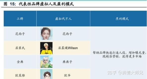 Epic Games提供高保真虚拟人制作平台,深度绑定UE引擎,极大简化虚拟人制作流程,未来或将通过收取平台提供的技术服务费、云托管费、素材库费用等方式变现。Epic Games拥有全球顶尖的引擎技术,Unreal Engine目前已被广泛用于游戏、 电影制作中,主要盈利方式是从基于UE引擎打造的游戏中抽取5%的收益。2021年2 月,Epic推出基于UE引擎驱动的MetaHuman Creator(MHC),帮助游戏、影视从 业者以更轻松的方式制作高保真的虚拟人。可复用的底层功能对于未来虚 拟世界的打造至关重要,能够有效降低技术成本,同时将大量创作者聚集在平台。 在算力与存储方面,MHC采用云托管服务,进一步解放创作者的算力及存储压力。 门槛的降低或将推动虚拟人的平民化,推动虚拟人触达更多C端用户,并吸引到自己 的平台。(四)内容及运营:由内而外赋予虚拟人 “灵魂”及外形内容由内而外赋予虚拟人“灵魂”与外表,这个环节的参与者包括MCN机构、娱乐公司以及营销公司等。1.MCN机构:复制真人网红的成熟运营模式,虚拟KOL可控性更高MCN运营虚拟KOL的方式与运营真人网红的传统模式差别不大,有一套成熟的、经过市场验证的打法。目前多以抖快、小红书、B站等社交平台为主攻阵地,提供人设、 形象、故事等内容,打造并运营爆款虚拟网红,在时尚、美妆、科幻等领域变现。MCN机构的商业变现能力较强,通过与美妆护肤、时尚等品牌达成商业合作,很大程度上可以覆盖创作成本,盈利较为可观。运营虚拟形象风险相对低,创作机构可 以完全拥有账号的管理权,来实现更稳定的长期盈利。燃麦科技打造的超写实数字 人AYAYI已与LV等多个品牌展开合作,创壹视频打造的视频虚拟人柳夜熙在抖音已 有600万粉丝。目前多家头部投资机构均有对虚拟人MCN机构进行投资,次世文化 在今年10月完成了由网易领投的数百万美元的A+轮融资。但是,打造虚拟人网红或 主播在技术、运营等方面投入成本很高,打造视频化虚拟人的MCN公司前期投入成 本有的高达百万,后续维护过程中的每条更新视频制作成本同样高昂。因此,只有 真正有内容产出能力的公司,才能在行业长期发展中突围。我们以次世文化为例看MCN机构如何赋予虚拟人以“生命”。次世文化从场景出发赋虚拟人内容,设定好虚拟人的性格、喜好、个人特点,用鲜明的标签突出虚拟人的 差异化特性,再将虚拟人推向细分领域和细分受众群体。产品看,次世文化三 条产品线,有不同的内容输出模式。 第一条产品线是明星虚拟形象产品线,2B、2C的应用及变现场景明确。次世文化在 内容端,基于明星本人及团队诉求、粉丝诉求、合作品牌和项目诉求三方面,为包括 迪丽热巴、黄子韬、欧阳娜娜在内的一系列艺人设计虚拟形象,并不断用明星的字形象拓展新可能性。围绕迪丽冷巴单独开发的漫画在腾讯获得了超过2.5亿的人气, 帮助虚拟形象和明星本人一起成为护舒宝、阿尔卑斯的数字化品牌代言人。商业模 式方面,次世文化直接拥有版权,跟明星共创形象,所有收益按比例分成。 第二条产品线是品牌定制虚拟IP资产,后疫情时代,大量品牌开始使用数字化制作 方式延展品牌视觉物料,提前构建自己的数字资产,为未来与虚拟世界的深度链接 提前布局。在品牌线,次世文化为花西子、I do等超过10个品牌数字资产,基于 品牌调性,设计不同形象风格、人设特点的虚拟人,拥有非常强的量产IP化能力。为 花西子打造的虚拟人“花西子”自带传统古典雅静气质,与花西子品牌调性相得益彰, 都具备东方文化色彩。商业模式方面,品牌一般选择全案性合作方式,次世文 化负责提供虚拟人制作内容、打造方式、推广渠道等全流程的服务,收取服务费用。 第三条产品线是原创产品线,次世文化拥有包括超写实国风KOL“翎”、虚拟DJ purple、 国风少女南梦夏在内的多个虚拟形象。次世文化擅长找到适合的细分领域,打造头 部IP,并基于赋予其的独特人设,对接符合虚拟人标签的品牌合作。以“翎”为例,世文化为“翎”设定了中国虚拟文化传承人的身份,“国风”、“传统文化”成为其最为鲜 明的标签。后续运营中,“翎”在央视《华彩少年》演唱京剧选段《天女散花》,更有 望跟冬奥等大的国家项目有深度合作。商业模式方面,次世文化的角色接近娱乐司、MCN机构。2.品牌:打造与品牌调性完全相符的代言人,快速切入年轻圈层以品牌的形象、价值理念、文化特点等要素打造独有的虚拟人形象来代言品牌,利用社交媒体覆盖市场,快速切入年轻圈层,增加品牌曝光量。对于成熟品牌,虚拟 代言人可以打破固有传统形象,品牌方打造符合自身文化的品牌特点的虚拟形象代 言人,融入年轻消费者,拓宽市场。对于起步较晚的新型品牌,可以帮助品牌快速打 造人设,实现精准营销,获得更多市场。虚拟代言人的“安全性”会更高,还可以利用微博、小红书等平台进行独立的IP运营。 虚拟形象代言人相比请明星代言的方式费用更低,抗风险能力也更强,并且运营周 期长,可迭代性强。同时,品牌虚拟人IP资产归品牌所有,能够形成品牌自有资产沉 淀。屈臣氏推出的首位虚拟形象代言人屈晨曦Wilson拉进与年轻人距离,花西子推 出首个品牌虚拟形象“花西子”引领国货新风尚。目前品牌多通过借力营销服务商来实 现品牌虚拟代言人的创造及运营。(报告来源:未来智库)