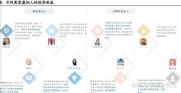 二、产业链:技术与内容作为输入,打造不同商业模式(一)虚拟人类型:按商业模式划分为 IP与非 IP 型行业发展至今,市面上已经有诸多不同类型和应用模式的虚拟人,按效益、商业模式的不同,我们将虚拟人定义为两类:IP型与非IP型。IP型短期内依托 粉丝经济变现效率高,非IP型长期看所占份额更大。IP型虚拟人:依靠粉丝经济创造经济效益,是当前更受关注的一大类别,柳夜熙的面更是进一步推升了热度。这一市场规模从看,也已经非常可观。但长期看, 数量维度来讲,元宇宙中IP型虚拟人的占比很低。我们按照对接企业和变现的 不同将IP型虚拟人进一步划分为:MCN机构定制的KOL类虚拟人,娱乐公司定制、 有一定才艺的偶像类虚拟人,品牌定制、符合自身调性的品牌类虚拟人和以真人星为原型的明星原型类虚拟人4大类。非IP型虚拟人:作为功能性场景应用,以服务为主,单个虚拟人产生的经济效益不会 像IP型虚拟人那么大,但是作为虚拟世界的基础要素,能够产生庞大的产值规模。根 据是否用于商业用途可以分为商业类和非商业类。非商业类虚拟人主要集中在研究领域,不以创造经济价值为目的,仅作为前沿科技研究成果的展示,本报告对 此不做探讨。商业类虚拟人我们根据是否直接参与业务创收环节,划分为基础服务 型、身份型和直播带货型3大类(实际直播带货也是基础服务的一项,因商业化 速度更快我们单独分类)。基础服务型虚拟人对造型、互动的要求较低,不能为企业 直接创收,主要通过降低人力成本、拓展业务场景的方式为企业带来营运效率提升。 移动互联网世界,基础服务型虚拟人也还在持续渗透;未来在元宇宙中,基础服务 型虚拟人将会成为虚拟世界的基本要素,代替移动互联网中的APP、UI界面功能, 承载人机交互的职能。身份型虚拟人就像游戏中玩家为自己创建的角色,未来在元 宇宙世界中,我们每个人都需要有属于自己的独一无二的虚拟分身。(二)虚拟人产业链:“技术+内容”共同赋能,大厂更具技术优势,多方参与内容环节虚拟人的“诞生”,需要上游“技术+内容”作为输入,继而输出下游不同类型的虚拟人,进行不同模式的变现。对应到产业链来看,技术方是虚拟人产业链的上游,包括渲 染建模、动捕面捕、AI技术、XR设备厂商等等,负责完成虚拟人的制作。中游则是 内容产出环节,包括MCN、娱乐经纪公司、营销公司等,负责虚拟人IP的策划、运 营,为上游技术方提供虚拟人的人设、形象设计(或提出需求),上游技术公司通过 建模、动捕等技术,制作出相应的虚拟人形象,交付中游内容产出公司。中游的内容 方公司承上启下,负责运营虚拟人,并对接下游丰富应用场景和合作方,最终实现 虚拟人的变现。(报告来源:未来智库)
