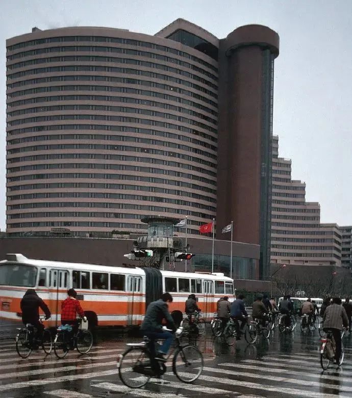 △1988年拍摄的漕溪路中山西路口交通岗亭及华亭宾馆(Bill Hawker 摄)