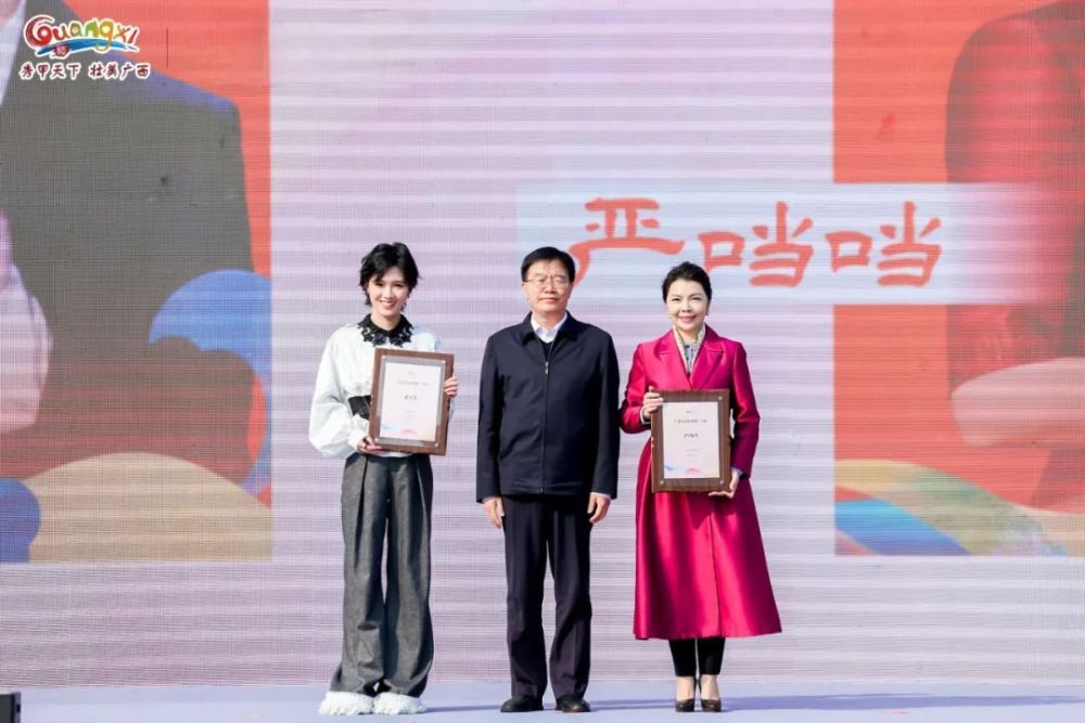▲活动现场,自治区人民政府副主席苗庆旺为“广西文化旅游推广大使”授牌