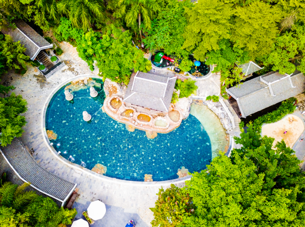 大碧头国际旅游度假区云田养生温泉的温泉水取自地下2500多米,出水温度可达50度,泡入温润的汤池中,享受山林间的静谧,体验“温泉水滑洗凝脂”的妙处。