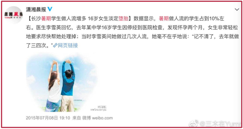据国务院妇儿工委办公室等发布的《中国青少年生殖健康调查报告》显示,“15岁~19岁女孩中8%有性经历且多次怀孕率高于20岁~24岁”。