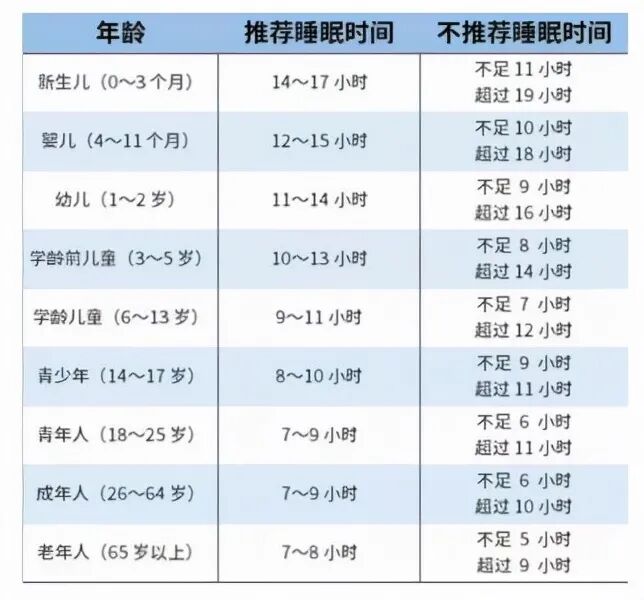 美国国家睡眠基金会的专家认为老年人每天的正常睡眠时间为5小时至9小时,成年人的睡眠时间为7小时至9小时。