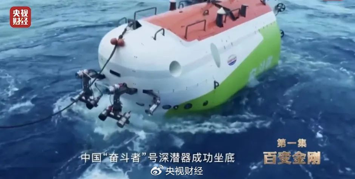 马里亚纳海沟,中国“奋斗者”号深潜器成功坐底,可以抵挡1100个大气压的载人球仓,由钛合金打造。