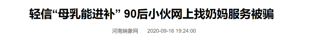 之前有一个新闻报道。有个90后小伙自觉身体虚弱,想补身体。老家朋友告诉他:人乳最补!小伙子信以为真,在网上一心求“奶妈”。不过讽刺的是,小伙子非但没有如愿以偿,还被中介骗了3000元。