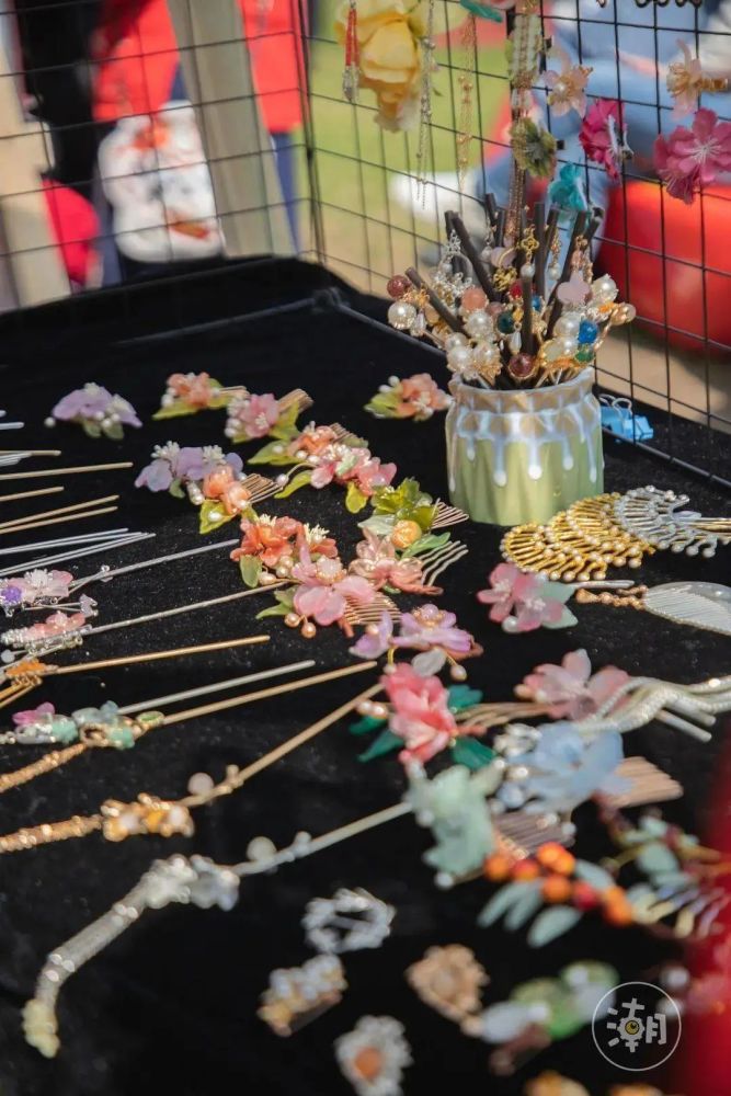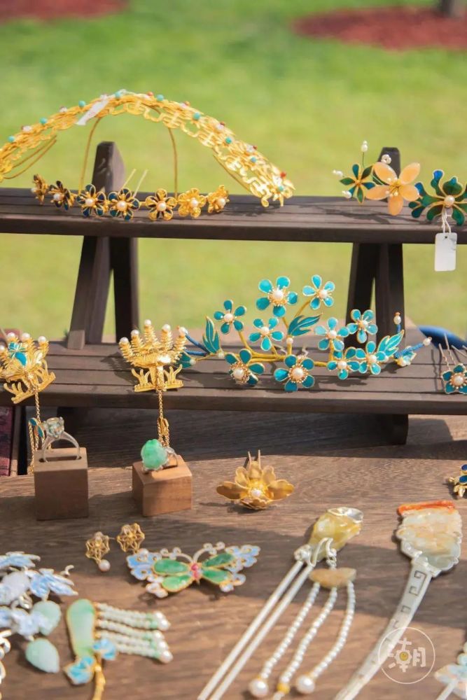 园内的汉风小集市也很值得一逛,由二十个汉服小铺组合成一片古风古韵的集市盛景,集市内容以汉服、汉服配饰、汉服周边为主,精致的样式吸引了每一位路过摊位前的游客,都不由自主停下来观赏,淘淘好物。
