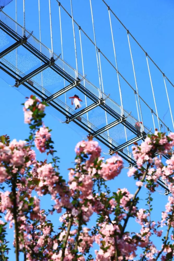 热门项目1:玻璃桥漫花庄园的玻璃桥是必打卡点之一,高35米,宽3.6米,总长228米,投资2000多万元,是四川省目前最长、最宽的玻璃桥。该桥根据花海地形依山而建,气势恢宏,飞跨600亩花海秘境,制造360度凌空全景,由70块透明特种玻璃构成,含8块特效玻璃。