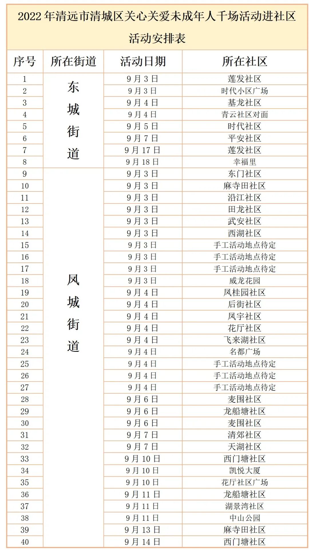 关心关爱未成年人系列活动9月,清远市清城区精神文明建设委员会办公室联合凤城街道、东城街道、洲心街道、横荷街道持续开展2022年清远市清城区“关心关爱未成年人千场活动进社区”系列活动。清城区新时代文明实践中心、清城区志愿服务促进中心、清城区校外未成年人心理辅导站继续携手为清城区广大未成年人群体派送欢乐,亲子活动、文明实践志愿活动和心理健康辅导等不同主题的活动走进四街的61个城市社区,务必做到总有一场活动在你身边!
