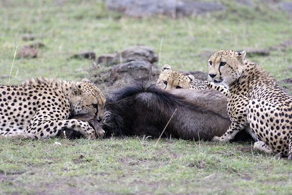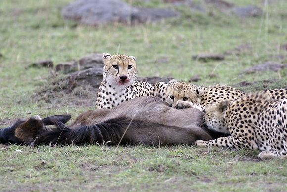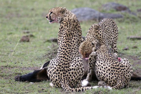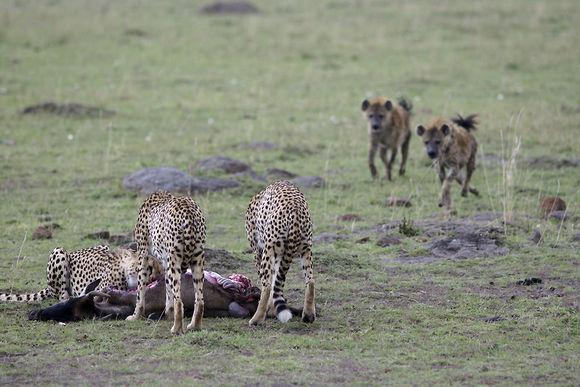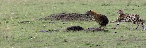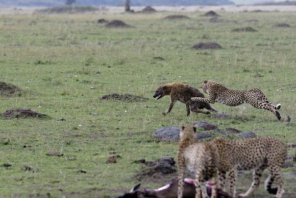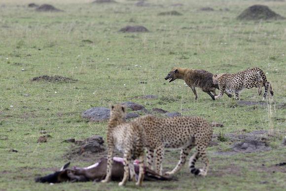 猎豹虽说是非洲大草原的独行侠,但是在脱离了妈妈的照料之后会和兄弟们结成同盟一起狩猎,而猎豹妈妈产量还可以,经常带着两三个甚至五六个宝宝,所以猎豹并不总是独自行动。下面的猎豹兄弟就成功驱赶了鬣狗,鬣狗啊鬣狗你也有今天。
